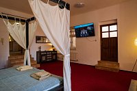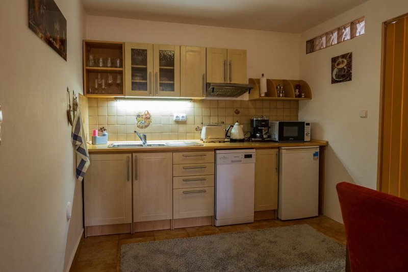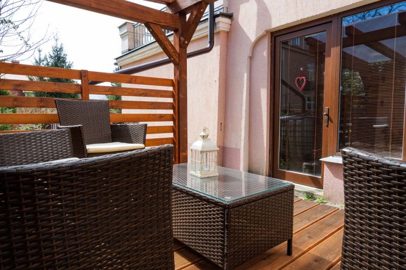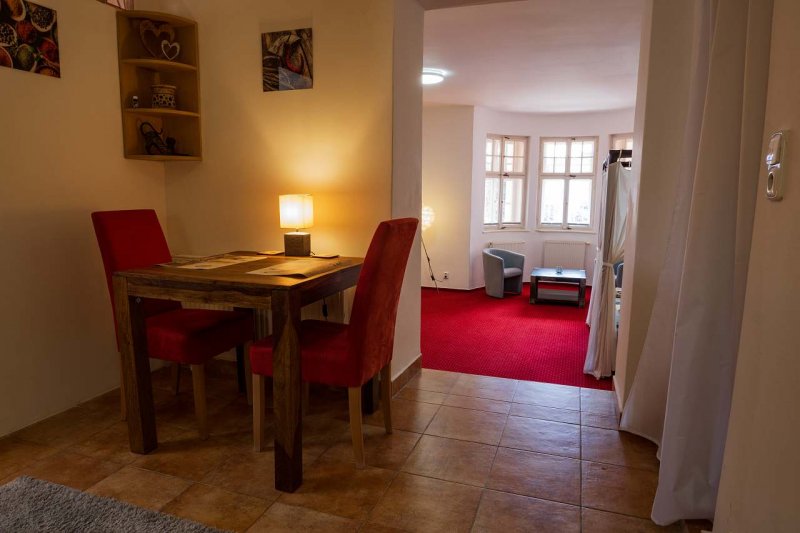 Romantický apartmán je umístěn v přízemí vily postavené v roce 1912.Má samostatný vstup mimo hlavní vchod do domu přes zimní zahradu, která je součástí apartmánu. Jedná se o klidné místo, ačkoliv dům leží velmi blízko centra města. Apartmán je zařízen manželskou postelí s nebesy z masivního dřeva. V kuchyni je jídelní stůl se dvěma židlemi a je vybavena kávovarem, toustovačem, mikrovlnnou troubou, rychlovarnou konvicí, myčkou nádobí a minibarem. V pokoji je posezení s dvěma křesílky a konferenčním stolkem a velkou plazmovou televizí. Po dohodě je možnost úschovy jízdních kol, či lyží v garáži u apartmánu, nebo v přilehlém sklepě. Připojení na Wi - Fi je samozřejmostí.