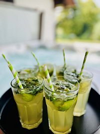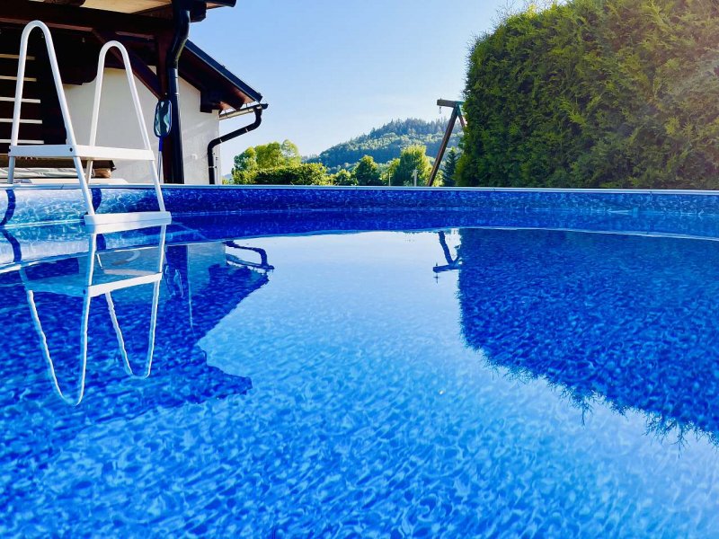Sezónní letní vybavení: nadzemní bazén s pískovou filtrací a tepelným čerpadlem, zahradní posezení(v dostatečném množství), gril, trampolína a dětské hřiště (klouzačka, houpačky, pískoviště, domeček).