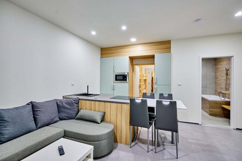 Apartmán je skvěle připravený i pro rodiny s dětmi – k dispozici jsou hračky, knížky, omalovánky a samozřejmostí je dětská postýlka. Nechybí ani dostatek úložného prostoru pro lyže, kola a sportovní vybavení. Velkou výhodou je flexibilita příjezdu i odjezdu – po domluvě je možné dřívější check - in nebo pozdější check - out, aby váš pobyt byl co nejpohodovější.
