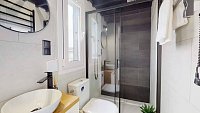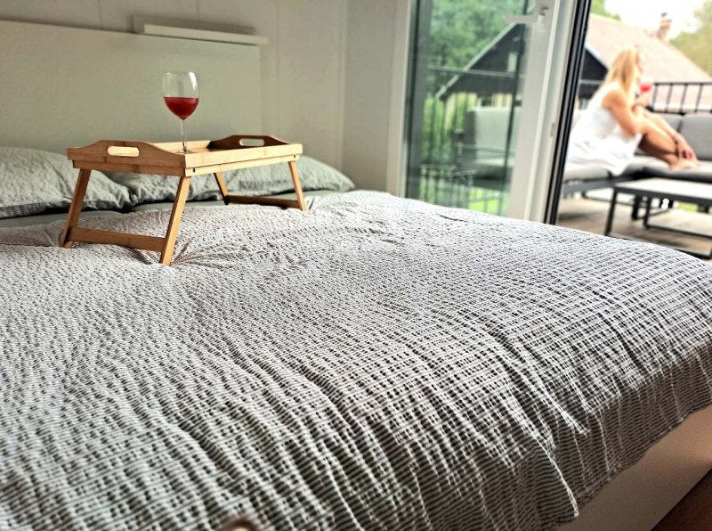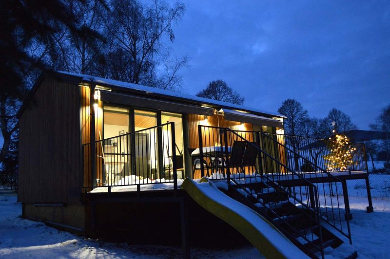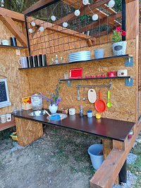 Po celé délce domečku je prostorná terasa s posezením u zahradního stolu nebo na gaučíku. Vcházet na ni můžete z obývacího pokoje s kuchyňským koutem nebo rovnou z ložnice. Nad terasou jsou umístěny markýzy.