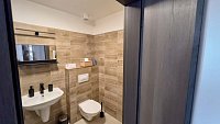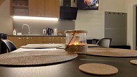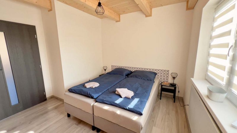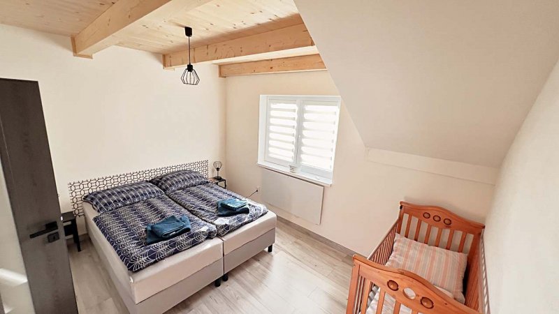 Každý apartmán disponuje vlastním sociálním zařízením, kuchyňkou a možností ubytování ideálně pro 4 - 6 osob. Pro přespání na 1 noc nebo po výslovné dohodě s ubytovatelem lze nabídnout ubytování v každém z apartmánu až pro 8 osob /např. při obsazení obou apartmánů jednou skupinou. Apartmány mají společnou oplocenou zahradu s posezením. Zahrada se vstupem do domku s apartmány i hlavní část ubytování je situována do velmi klidné uličky v areálu vinných sklepů, z ulice Ke Špičáku. Můžete si zde tedy třeba po náročném cyklovýletu v klidu sednout na terase pod slunečník, ugrilovat dobré jídlo a s pohárkem vína v ruce relaxovat. Pro děti jsme na dvorku připravili skluzavku, kryté pískoviště, houpačku, atd.