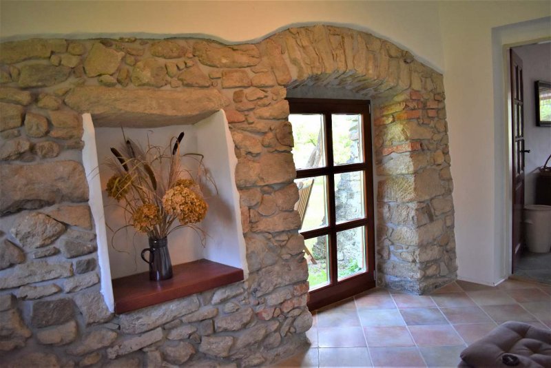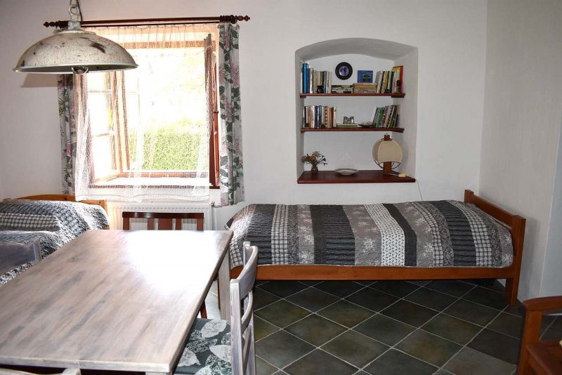 Apartmán je součástí kamenného statku, kde je příjemný chládek i v těch nejparnějších dnech. Na rozlehlé zahradě můžete posedět ve stínu jabloní...