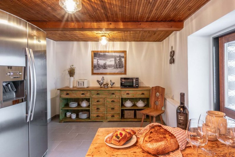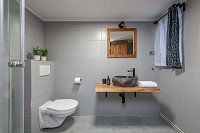 Každý pokoj má svoji koupelnu s umyvadlem, WC a sprchou, šamponem a sprchovým gelem a fénem na vlasy. Uvnitř chaty se nachází velká společenská místnost s krbovými kamny, gaučem a chytrou televizí vybavenou aplikacemi YouTube, Netflix, O2 TV aj. Plně vybavená kuchyň vám poskytne zázemí pro vaše kulinářské vyžití. Srdcem kuchyně je velký elektrický sporák s troubou, dále pak americká lednice s výrobníkem ledu a filtrem na pitnou vodu, myčka na nádobí, rychlovarná konvice, topinkovačem, mikrovlnná trouba, kapslový kávovar Krups Nespresso. Samozřejmostí je kompletní souprava nádobí. V úklidové místnosti naleznete pračku, sušičku, žehličku, žehlicí prkno a věšák na prádlo.
