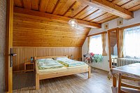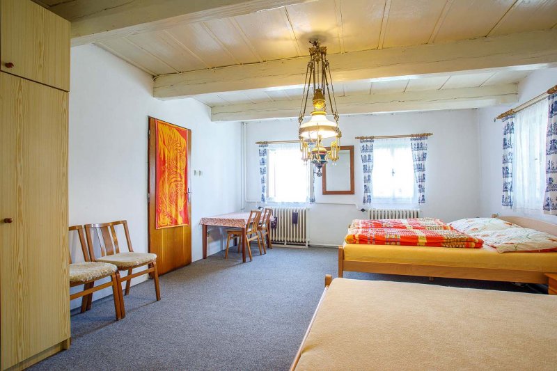 Chalupa v obci Krátká: 5 ložnic, celkem pro 2 až 14 osob. Orientační cena (za osobu za noc): léto 500kč, zima 550kč.