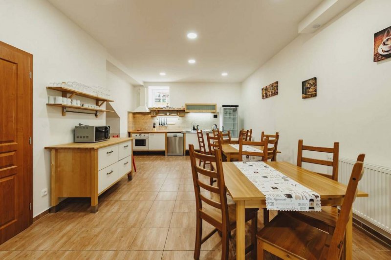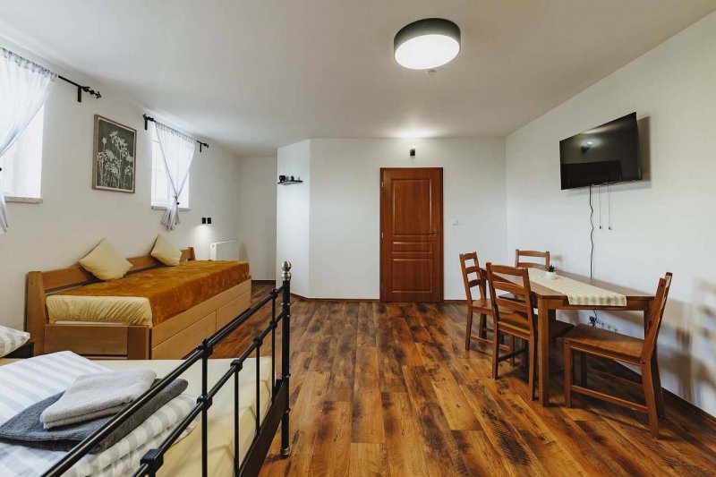 Apartmán v obci Dobrá - Stožec: 8 ložnic, celkem pro 4 až 25 osob. Orientační cena (za osobu za noc): celoročně 520kč.