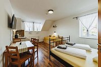 Apartmán v obci Stožec: 5 ložnic, celkem pro 1 až 19 osob. Orientační cena (za osobu za noc): celoročně 495kč.