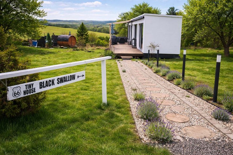 Navštivte Wellness Tiny House Black Swallow ve stylu Route 66 se saunou, koupacím sudem a bazénem. Zajímavostí je, že je vybudován z lodního kontejneru známým youtuberem Markem Popáleným a název nese po legendárním motelu Blue Swallow v USA. Zasazen v krásném prostředí u Olomouce, v dosahu přírody, koní i města. Těšíme se na vás. Tiny House je umístěn na velké zahradě poblíž domu majitelů, kteří jsou nejen umělci a hudebníci, ale také fandové cestování po USA a Route 66,což seo odráží v exteriéru i interiéru stylového Tiny House. Není to jen ubytování, je to zážitek. Rodinná atmosféra, klid venkova. K dispozici bazén na zahradě a také finská sudová sauna a koupací sud vytápěný dřevem.