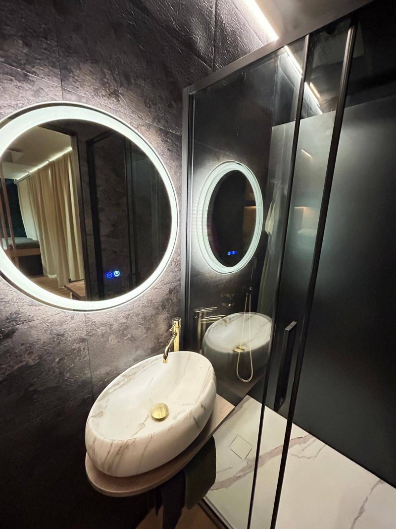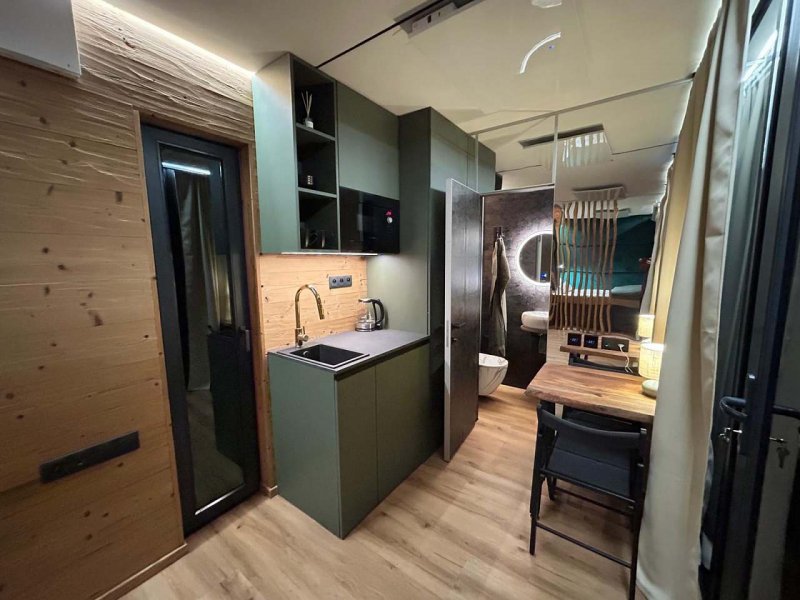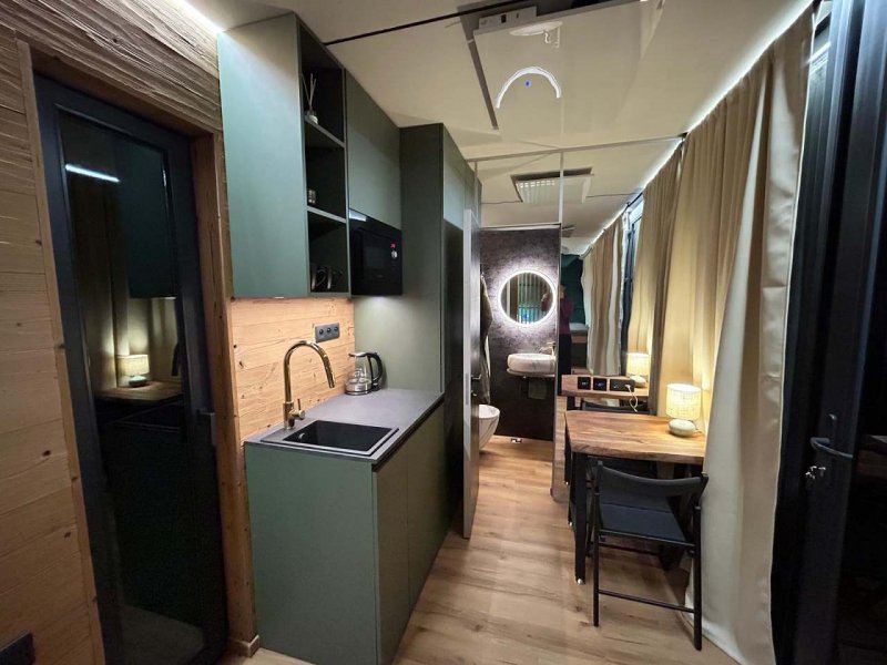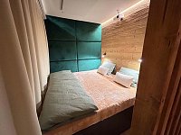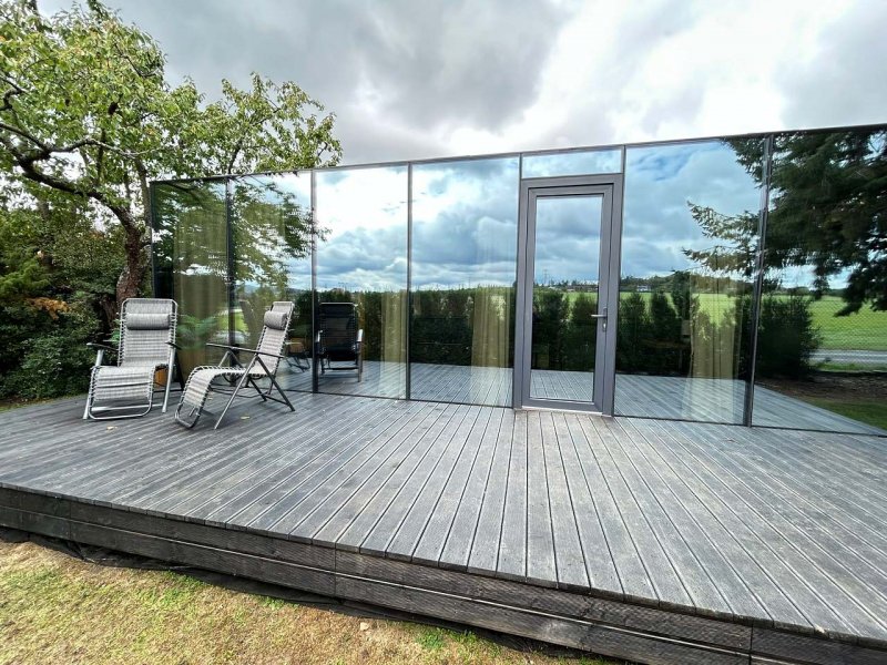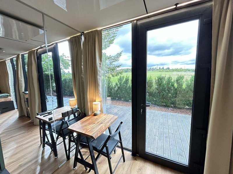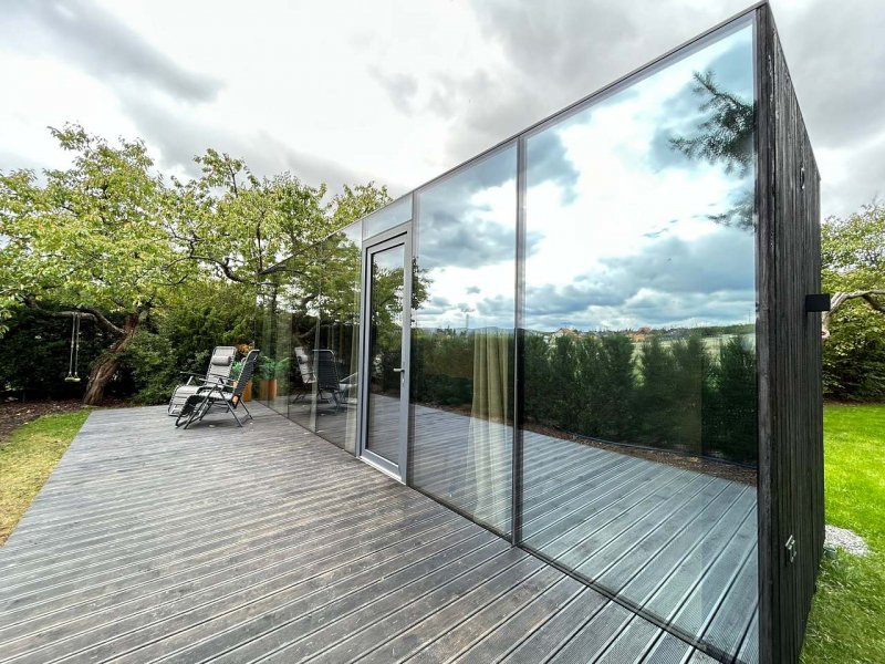 Za Zrcadlem je tiny domek, který má oddělenou část na spaní s postelí 2x2m a projektorem s velkým plátnem, obývací pokoj s rozkládací sedačkou 1,4x2m, kuchyňský kout pro pohodlné vaření, terasu s výhledem do okolí a zeleně, plnohodnotnou koupelnu se sprchovým koutem, umyvadlem, WC s bidetovou sprškou. Za Zrcadlem se pohodlně ubytují až 3 osoby. Za Zrcadlem najdete vše, co je potřeba pro vaši ničím nerušenou dovolenou v glamping stylu.
