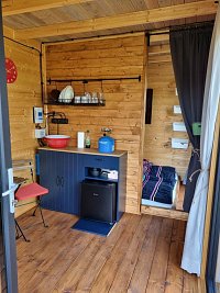 Tiny house je napojen na ostrovní fotovoltaický systém, který zajišťuje provoz el. energie (lednice, dobíjení telefonů, rádio, notebook, veškeré osvětlení).
