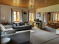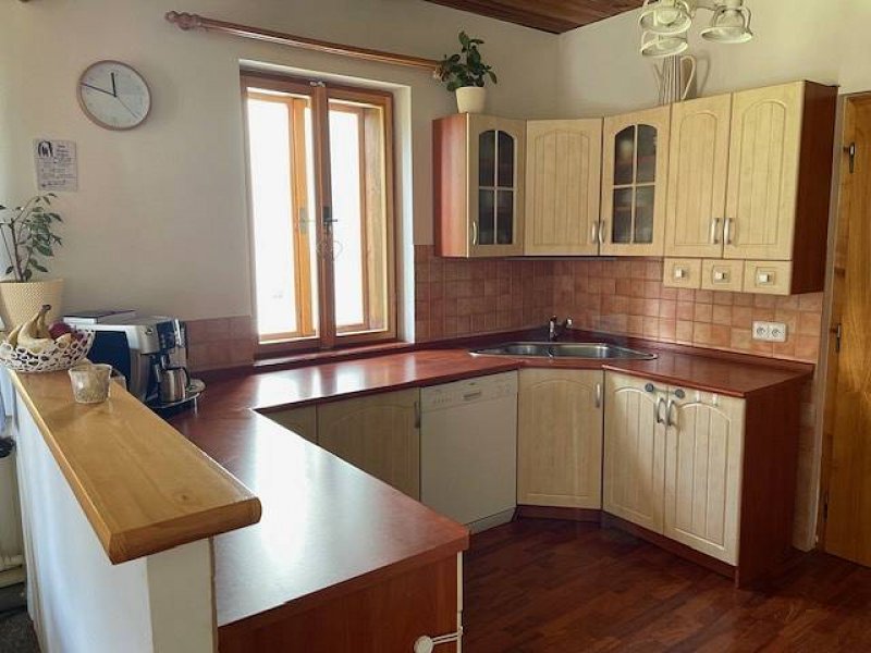 Dům, který je postaven samostatně na rozhlehlém travinatém pozemku nabízí 3 pokoje, prostorný obývací (společenský) pokoj s krbem, 2 kuchyně, 3 koupelny se sprchovým koutem, 3 WC, min. 4 parkovací stání.
