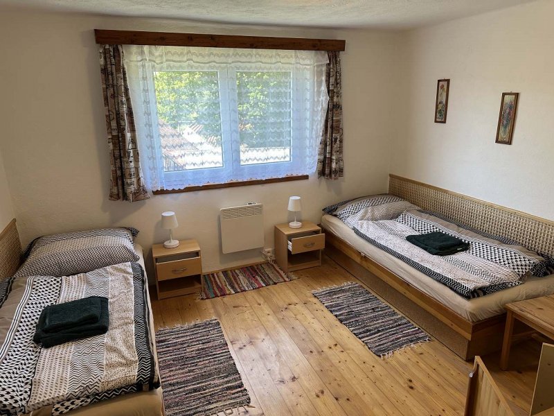 Chalupa v obci Velhartice: 3 ložnice, celkem pro 1 až 8 osob. Orientační cena (chalupa za noc): léto 3.800kč.