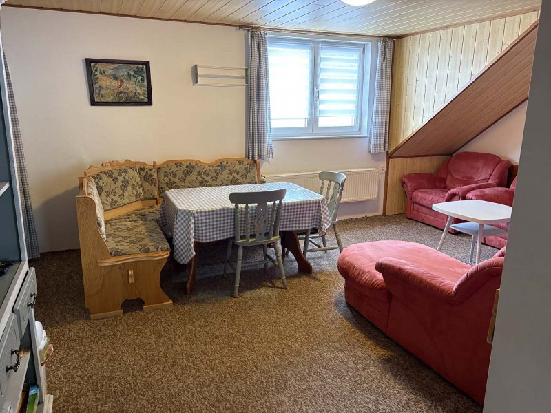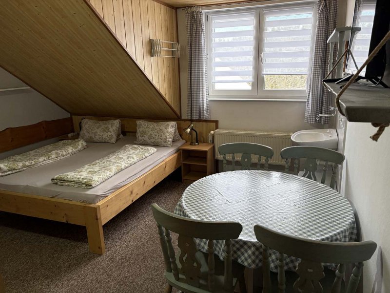 Nabízíme: Apartmán s dvěma ložnicemi v podkroví - Společenská místnost pro společné posezení a 2 ložnice: jedna - 5lůžek s balkónem., druhá - 4 lůžka. Ložnice jsou neprůchozí.