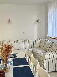 Ubytování U Hraničního zámečku je samostatně stojící atriový dům se třemi ložnicemi, obývacím prostorem se společnou jídelnou pro 6 lidí a luxusně vybavenou kuchyní.