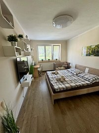 Naše ubytování se nachází v samotném srdci Šumavy, přímo v centru Národního parku, v klidné části obce Srní, jen pár kroků od lesa.