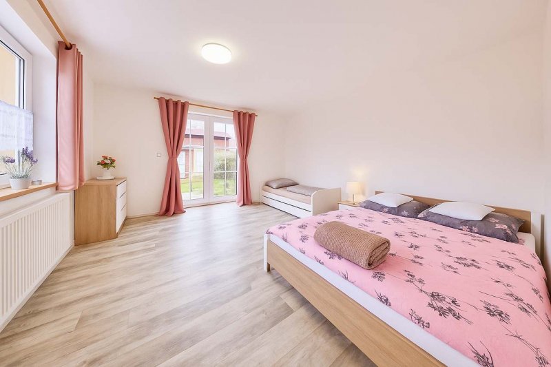 K odpočinku i zábavě slouží velká zahrada s plynovým grilem, v letních měsících bazénem, trampolínou a dětským hřištěm se skluzavkou. Na prostorné terase je připraveno posezení pro 8 osob a lavice až pro 6 dalších hostů.