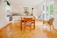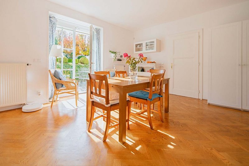 Vila Mořina se nachází v srdci Českého krasu, jen kousek pěšky od hradu Karlštejn a v blízkosti přírodních pokladů, jako je malebný lom Amerika a oblíbené cyklostezky a turistické trasy. Tento stylově zařízený apartmán spojuje dobový šarm s moderním pohodlím a nabízí jedinečnou atmosféru, která Vás přenese zpět v čase. Elegantní interiér s romantickými detaily a nádherný výhled do okolní zeleně vytvářejí ideální prostředí pro odpočinek a relaxaci. Vila je obklopena rozkvetlou růžovou zahradou, přičemž hosté mají k dispozici terasu před domem pro chvíle pohody v přírodě. Ať už hledáte únik od každodenního shonu, romantický víkend nebo rodinnou dovolenou, Vila Mořina je dokonalým místem pro Vás. S vynikající dostupností (28km od Prahy a 25km od letiště) je ideální základnou pro objevování krás Českého krasu, a zároveň zaručuje klidné prostředí pro odpočinek. Přijďte zažít kouzlo přírody a historické atmosféry v naší vile a vytvořte si vzpomínky, na které budete rádi vzpomínat. Hosté sice nemají přístup do přilehlých zahrad, ale k dispozici mají terasu orientovanou na jih, která se nachází před kuchyní. Z terasy se nabízí krásný výhled do zahrady, což zaručuje příjemné chvíle strávené venku při snídani nebo relaxaci na čerstvém vzduchu. Tato terasa je rovněž skvělým místem pro relaxaci, s výhledem do rozkvetlé zahrady, kde si můžete vychutnat šálek kávy nebo klidné odpoledne.