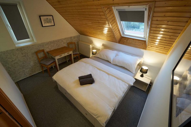 Nabízíme celoroční ubytování ve dvou apartmánech nacházejících se ve 2.patře administrativní budovy se zahradou. Vila se nachází v centru města Jeseník, a přitom v klidné části sousedící s městským parkem s tenisovými kurty, dětským hřištěm, 2 minuty chůze od autobusového a 10 min od vlakového nádraží. Z okna Vás odmění pohled na pohoří Hrubého Jeseníku s nejvyšším vrcholem Praděd.