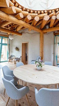 Srdcem domu je plně vybavená kuchyně a centrální prostor s velkým kulatým stolem, který lze snadno přeměnit na taneční parket. Východní výklenek zve k lenošení na pohovkách, jižní zase k posezení u krbu. Velké prosklené vstupy, světlík a dvě zastřešené terasy – slunná jižní a romantická západní – propojují interiér s okolní zahradou a bazénem, takže si můžete užívat přírodu po celý den.