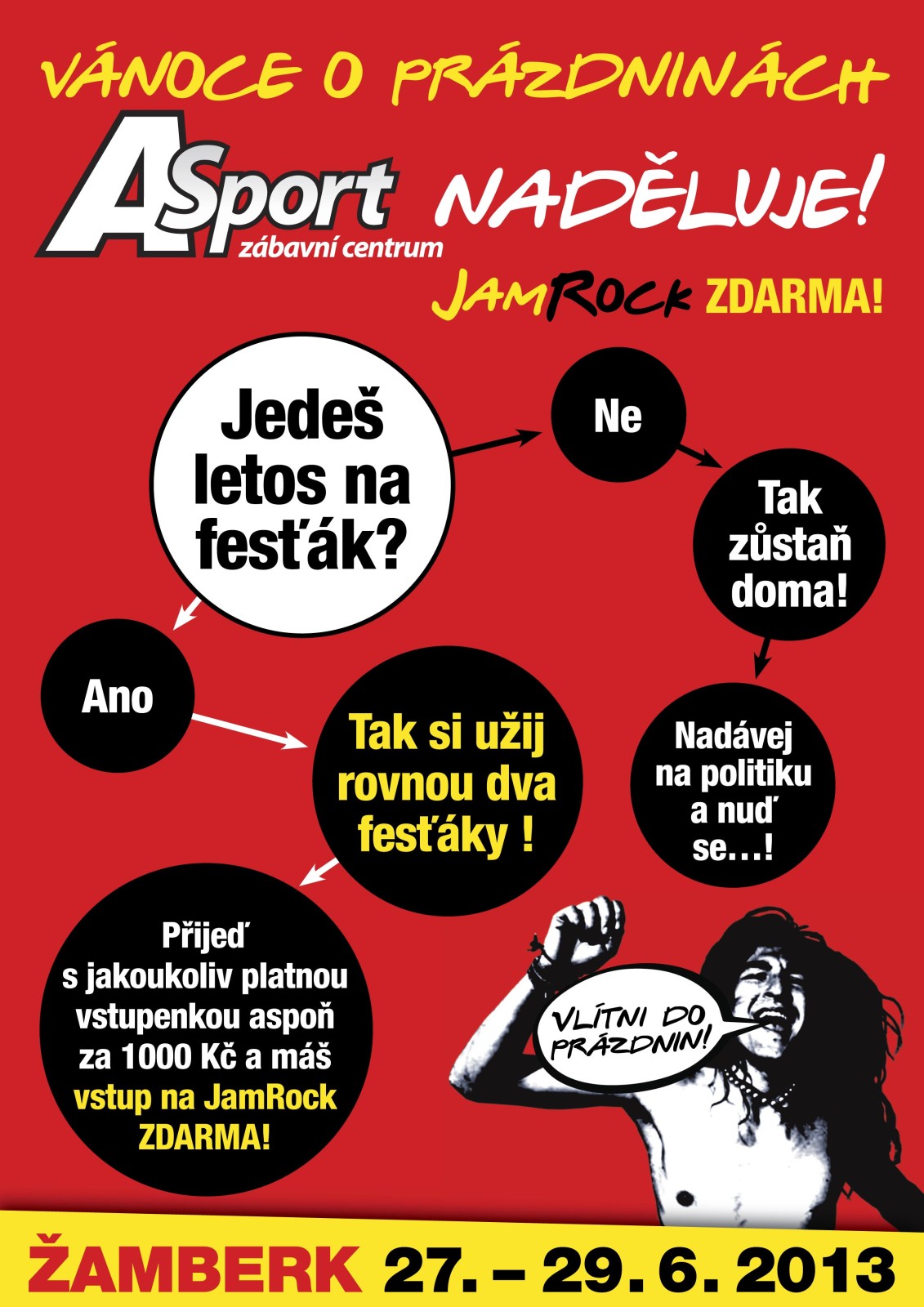 Firma A SPORT dává jako prázdninový dárek JamRock úplně zdarma všem, kdo mají zakoupenou celofestivalovou vstupenku na jakýkoliv festival za 1000Kč a víc !