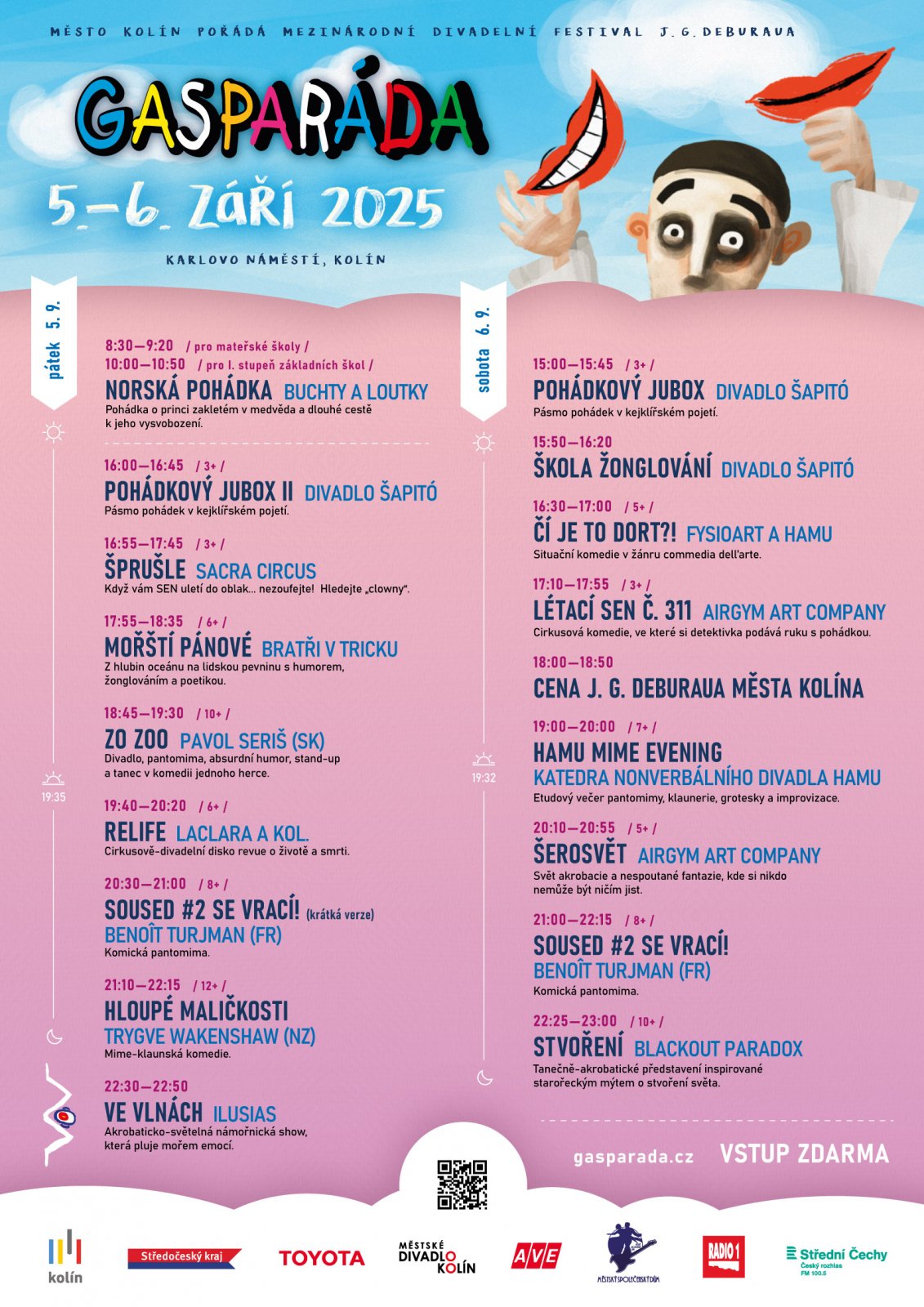 V pátek 5. a sobotu 6. září 2025 ožije Karlovo náměstí v malebném historickém centru Kolína divadlem! Nenechte si ujít šestnáct skvělých představení, školu žonglování a tradiční slavnostní udělení Ceny J. G. Deburaua města Kolína.