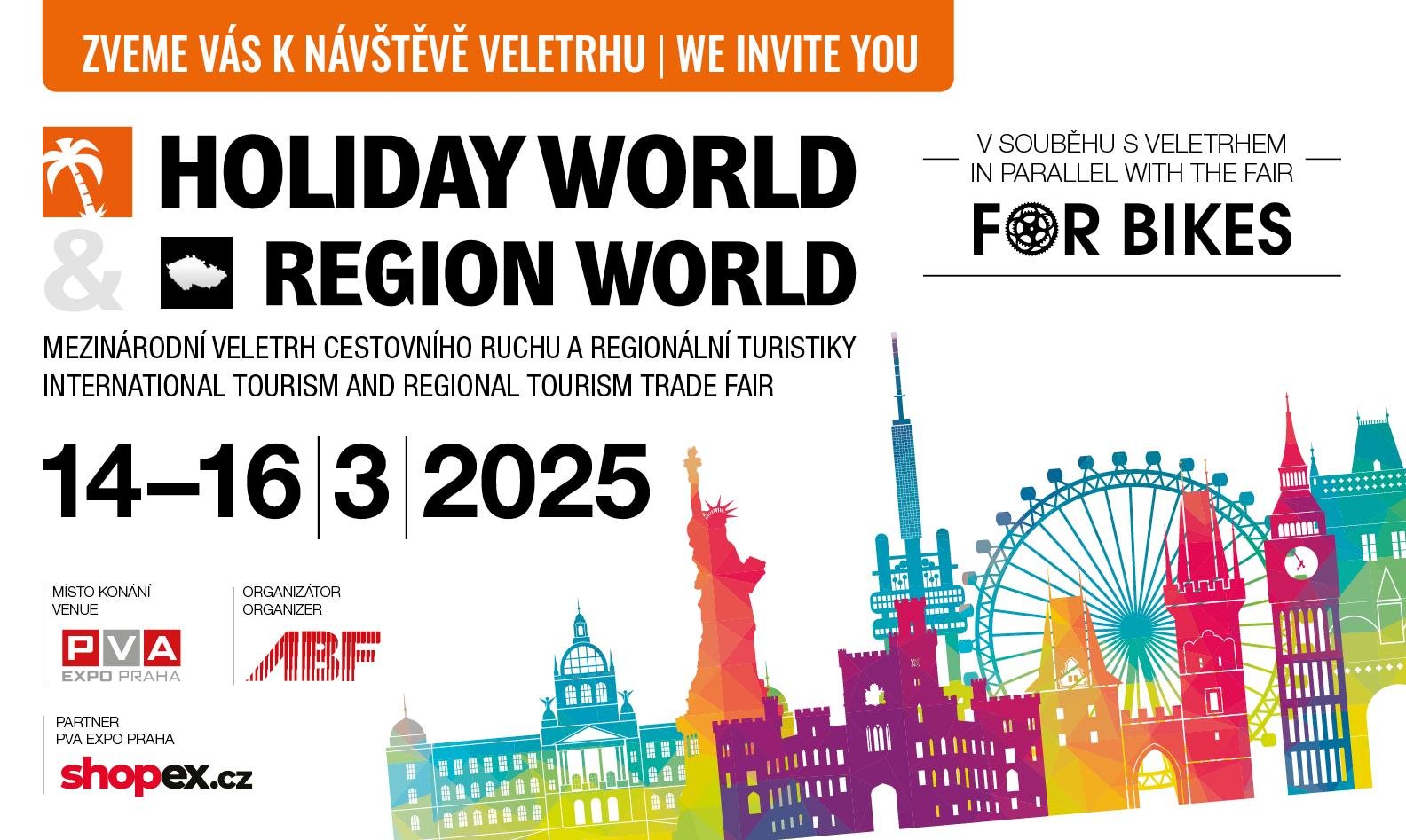 Vyberte si dovolenou z velkého množství výhodných nabídek! 33. ročník mezinárodního veletrhu cestovního ruchu a regionální turistiky HOLIDAY WORLD & REGION WORLD je jednou z nejdůležitějších akcí tohoto zaměření v České republice. Uskuteční se ve dnech 14. - 16. března 2025 opět v areálu PVA EXPO Letňany, opět pod taktovkou pořadatelské společnosti ABF.