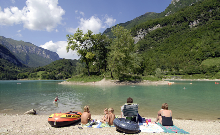 Riva del Garda, Torbole sul Garda, Arco a také Lago di Tenno jsou místa, kde se lze zároveň slunit a odpočívat ve stínu. Sportovat, osvěžit pod sprchami na pláži nebo využít toalety, pronajmout si lehátka a líně pozorovat ty sportovněji založené, jak si “dávají do těla”. Pláže jsou neustále kontrolované a udržované, jejich součástí jsou také plovoucí platformy vhodné pro snadnější přístup plavců a pro skoky do vody. Také ti nejmenší se mohou v klidu koupat, v letních měsících působí na plážích v Riva del Garda a v Torbole školené záchranářské týmy jak na suchu tak na vodě.