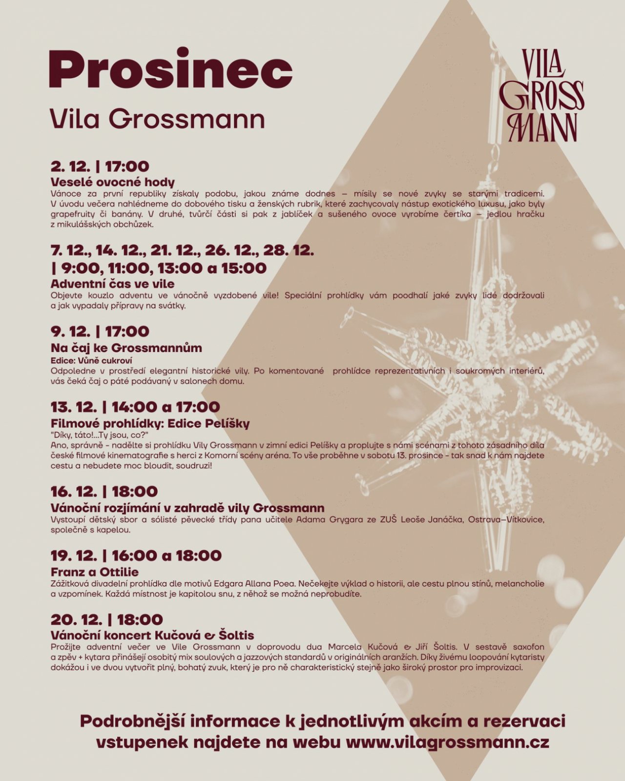 Podrobnější informace k jednotlivým akcím a rezervaci vstupenek najdete na webu www.vilagrossmann.cz.