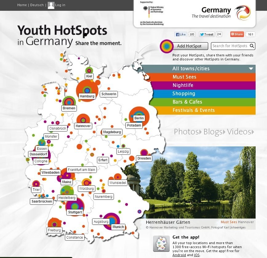 Německá turistická centrála (DZT) rozvinula svou mobilní aplikaci „Youth HotSpots“ vytvořenou v rámci tematického roku „Mladí cestují do Německa – HotSpots, Brandnew, Lifestyle“. Mladí cestovatelé, kteří cestují ve společnosti svých chytrých telefonů, se mohou nově informovat o dalších 250 vybraných atraktivitách v Německu, které byly do aplikace přidány od jejího startu v březnu 2013, a kromě toho mohou uživatelé také přidávat vlastní tipy na bezplatné internetové sítě po celém Německu. Nová aktualizovaná verze aplikace s celoplošným náhledem aplikace je zdarma k dispozici na Apple Store a Google Play Store.