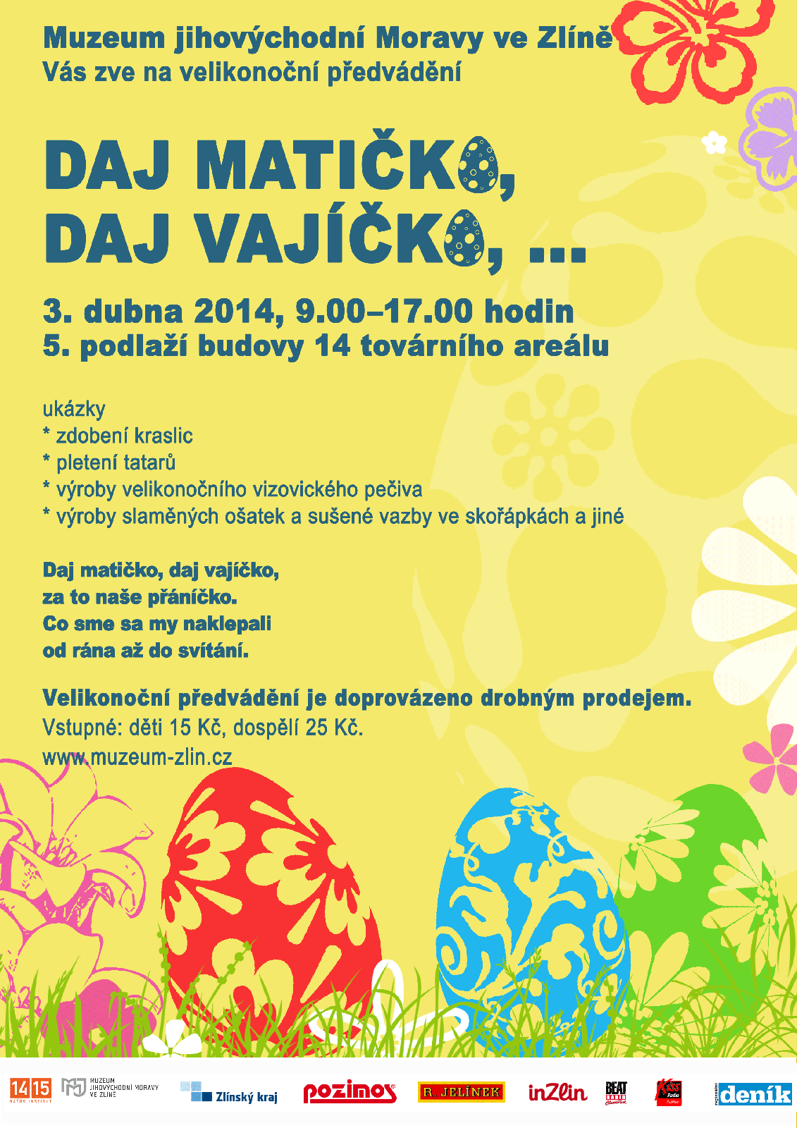 Muzeum jihovýchodní Moravy ve Zlíně připravilo na čtvrtek 3. dubna velikonoční předvádění s názvem Daj matičko, daj vajíčko,… Akce se uskuteční v 5. podlaží budovy 14 továrního areálu od 9.00 hod a potrvá až do 17.00 hod. Návštěvníci se mohou těšit na velikonoční řemesla i drobný prodej.