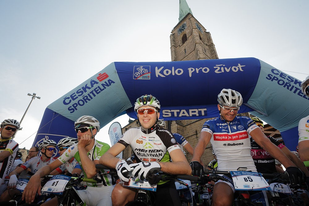 Start hlavního závodu na 55 km ovšem ještě probíhal v tom nejoptimističtějším duchu (bylo teprve 11:30), v centru Plzně na historickém náměstí Republiky bylo krásně. Neuvěřitelnou náhodou necelé 3 metry od cyklistů se starťákem probíhala upoutávka na plzeňskou sbírku pro nové zvony věže Chrámu sv. Bartoloměje se symbolickým názvem "Ze srdce zvon"! To měli v tu chvíli určitě všichni bikeři na náměstí. A protože ve stejný den probíhalo v Sudetech mistrovství republiky v maratonu, na staru chyběli nejúspěšnější jezdci letošního ročníku KPŽ, Pavel Boudný, Matouš Ulman a Václav Ježek. Zato se do první lajny pod modrou bránu KPŽ postavil mistr světa MTB XCO do 23 let Ondřej Cink (Multivan Merida) a celému téměř osmisethlavému pelotonu popřál hodně štěstí a závod odstartoval Martin Straka - ikona plzeňského hokeje.