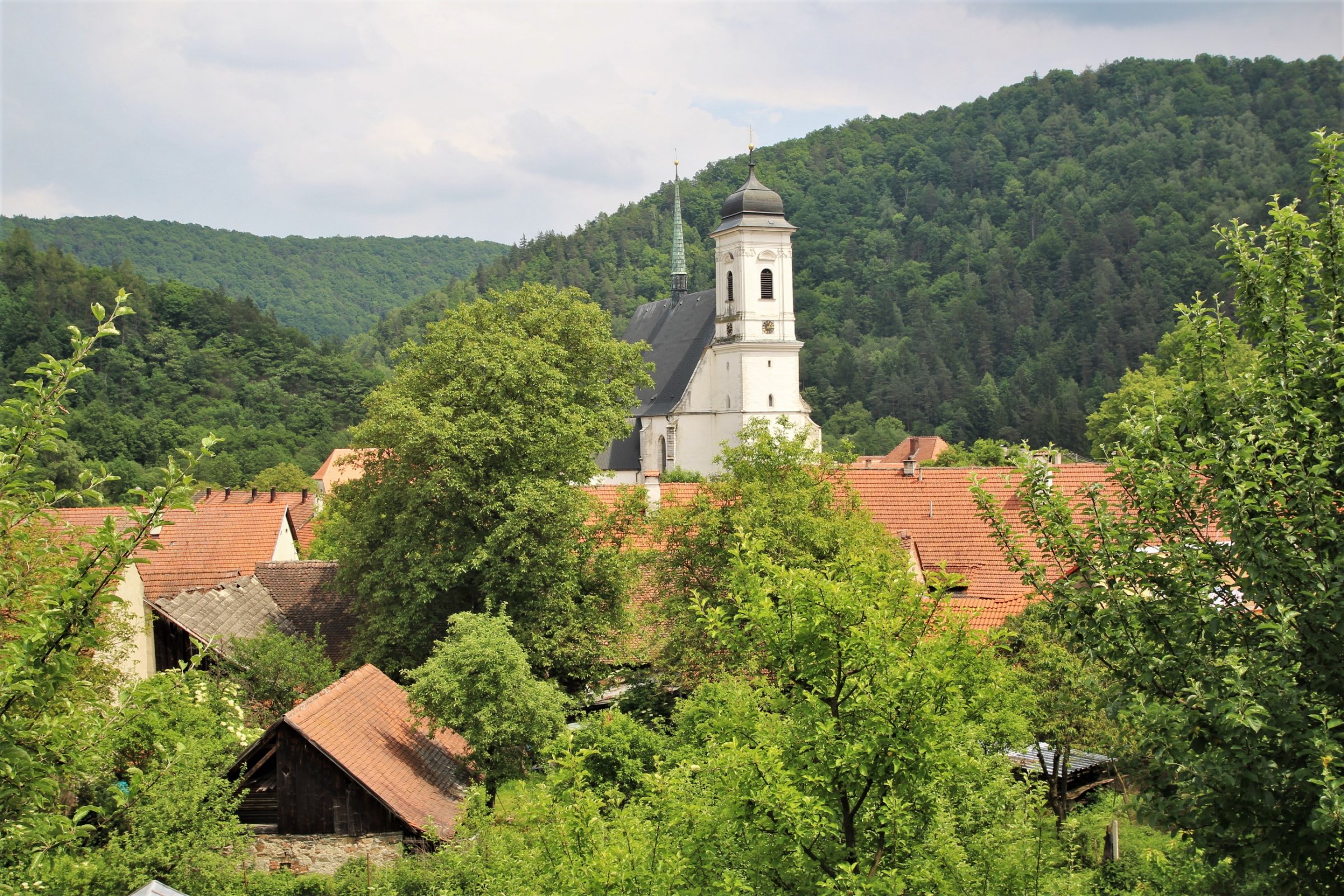 Pohled od náměstí na kostel Povýšení sv. Kříže