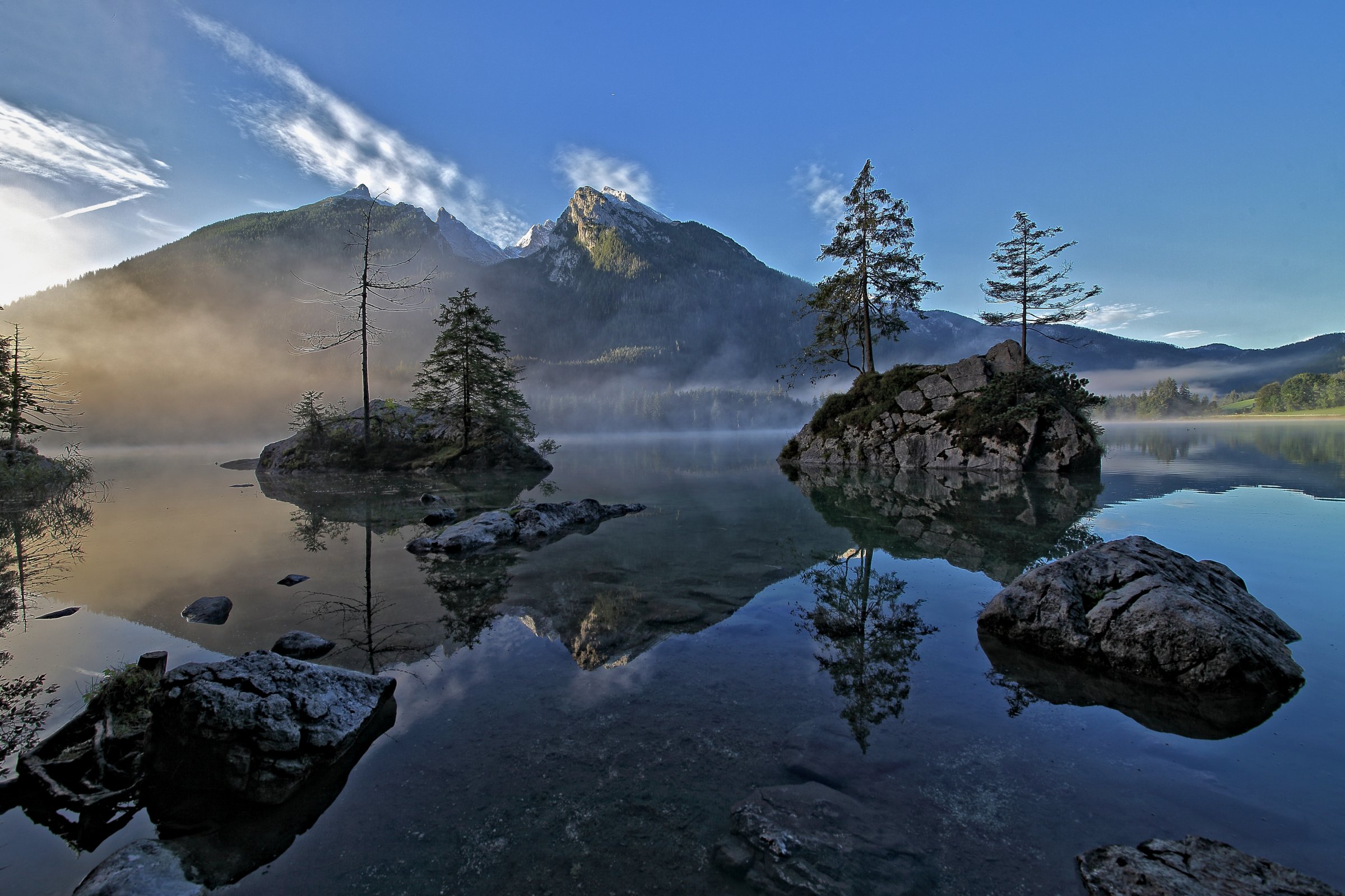 K jezeru Hintersee se vracím opakovaně pro kulisu, kterou tvoří Hory Schärtenwandkpf 2065 m, Schärtenspitze 2153 m, Steinberg 2065 m a Hochkalter 2608 m. Tentokrát po chladné noci s dvěma stupni Celsia bylo ráno v šest jezero zahaleno mlhou, kterou ranní slunce přeměnilo na mlhavý opar a tak poskytlo příležitost pořídit pár pěkných fotografií.
