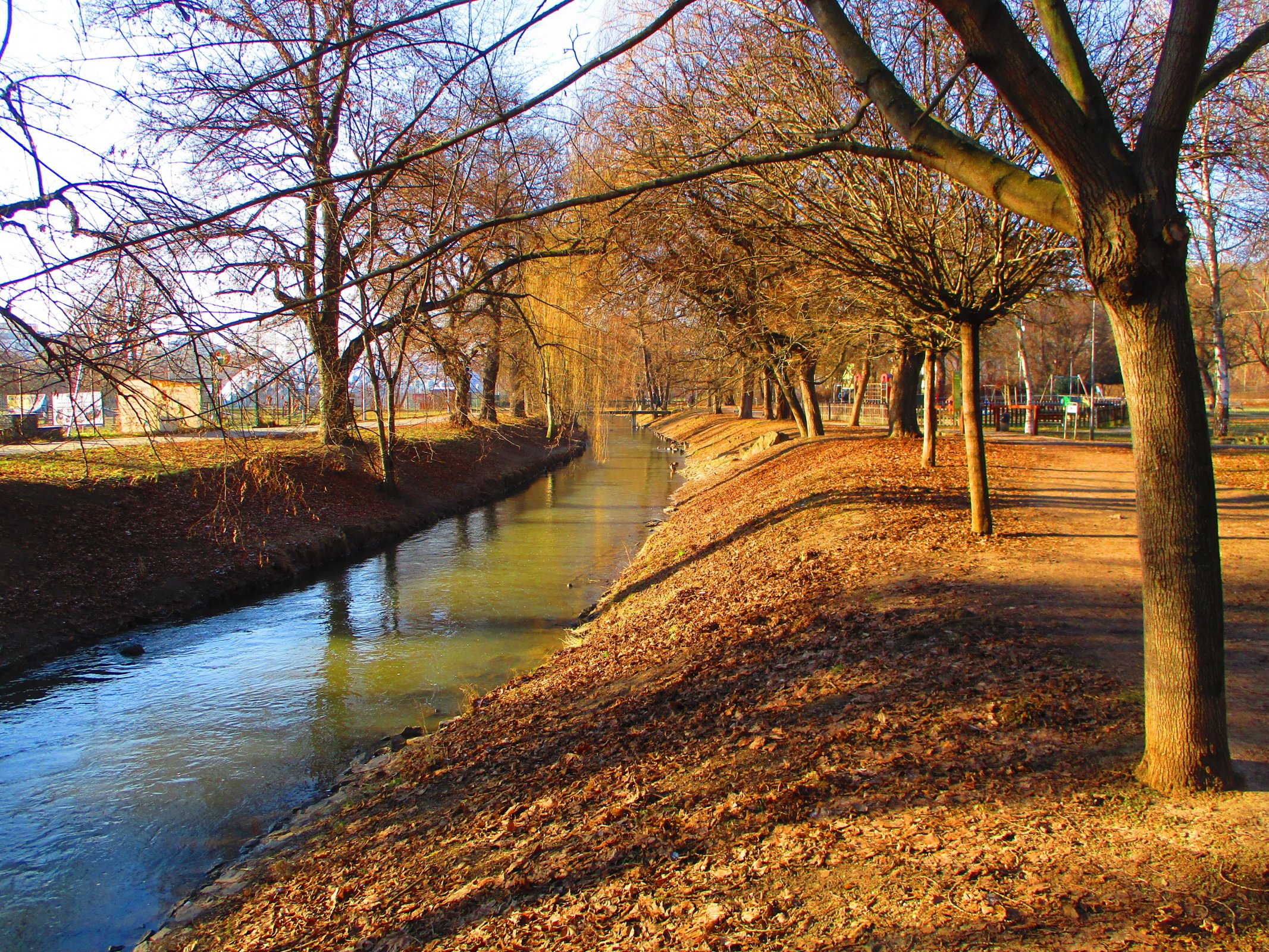 Jak vypadá libeňský Park Podviní a potok Rokytka v zimě bez sněhu.