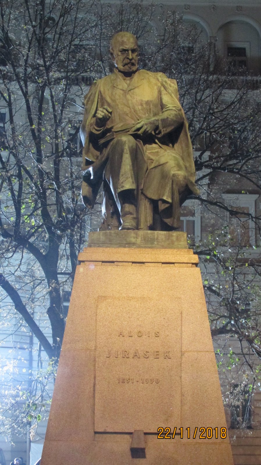 Podvečer u Jiráska a Tančícího domu 22.11.2018 Jiráskův pomník stojí jak jinak na Jiráskově náměstí a v blízkosti Tančícího domu (na rohu Rašínova náměstí).