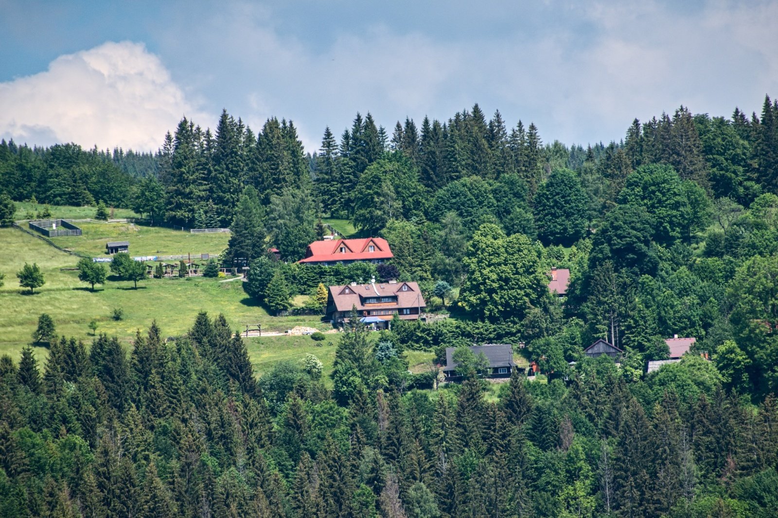 V pozadí turistická chata Kamenitý.Pohled s pralesa.