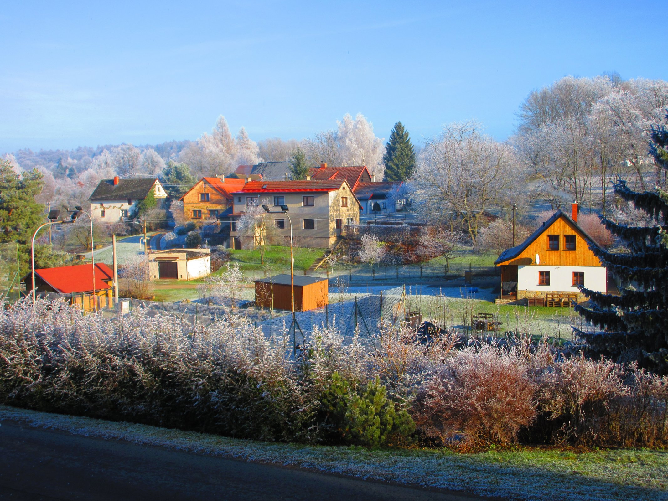 Prosluněný Ohnišov po inverzní namrzající mlze