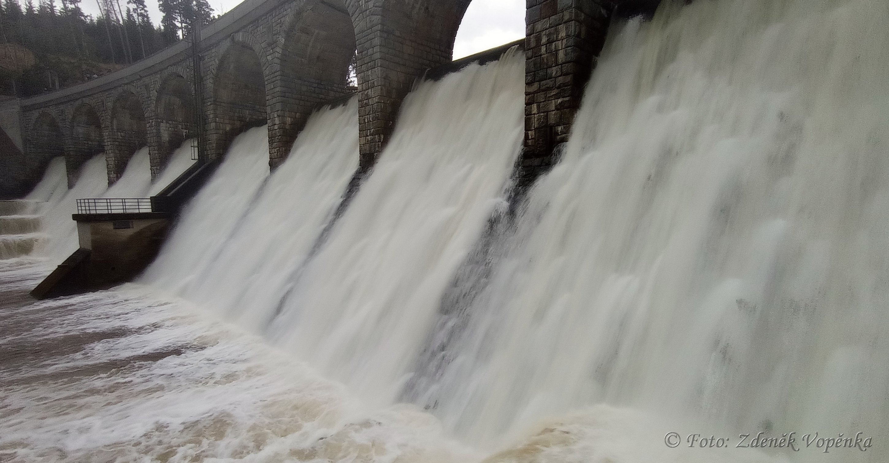 Přepad vody přes hráz Sedlické přehrady je jev výjimečný, za posledních deset let se to stalo pouze třikrát. V létě roku 2020, v roce 2015 a pak letos mezi vánočními svátky. Není proto divu, že se tady sešly stovky lidí.