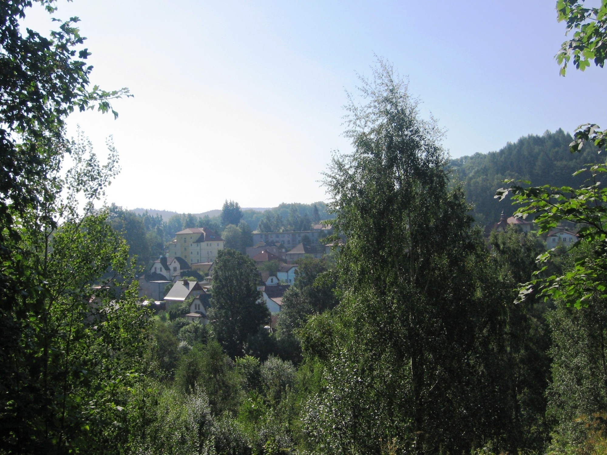 Trasa začíná na teplickém náměstí (foto 1) a její začátek je značen zeleně. Postranními uličkami města šplháme do kopce kolem autokempu Kamenec (foto 2 a 3) k lesu. Zde u sjezdovky (foto 4) odbočíme vlevo…