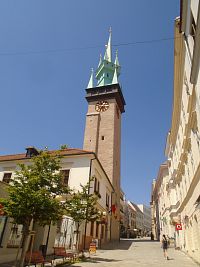 Stojí na pěší zóně v ulici Obrokové. Dosahuje celkové výšky 68,6 m a je symbolem a jednou z nejvýraznějších dominant města. Byla postavena v letech 1445-48 kamenickým mistrem Mikulášem ze Sedlešovic a patří k nejvýznamnějším pozdně gotickým stavbám u nás. Věž je zastřešena složitou konstrukcí se dvěma úrovněmi ochozů, zdobenou osmi menšími věžičkami. Původní břidlicová krytina byl…