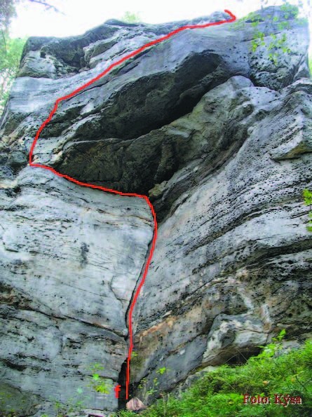 d) Cesta Velkého pátku V - 1. 4. 1988 Hasso Gantze, E.Merke. 2 m vpravo od hrany S stěny spárou na polici a přímo na vrchol.