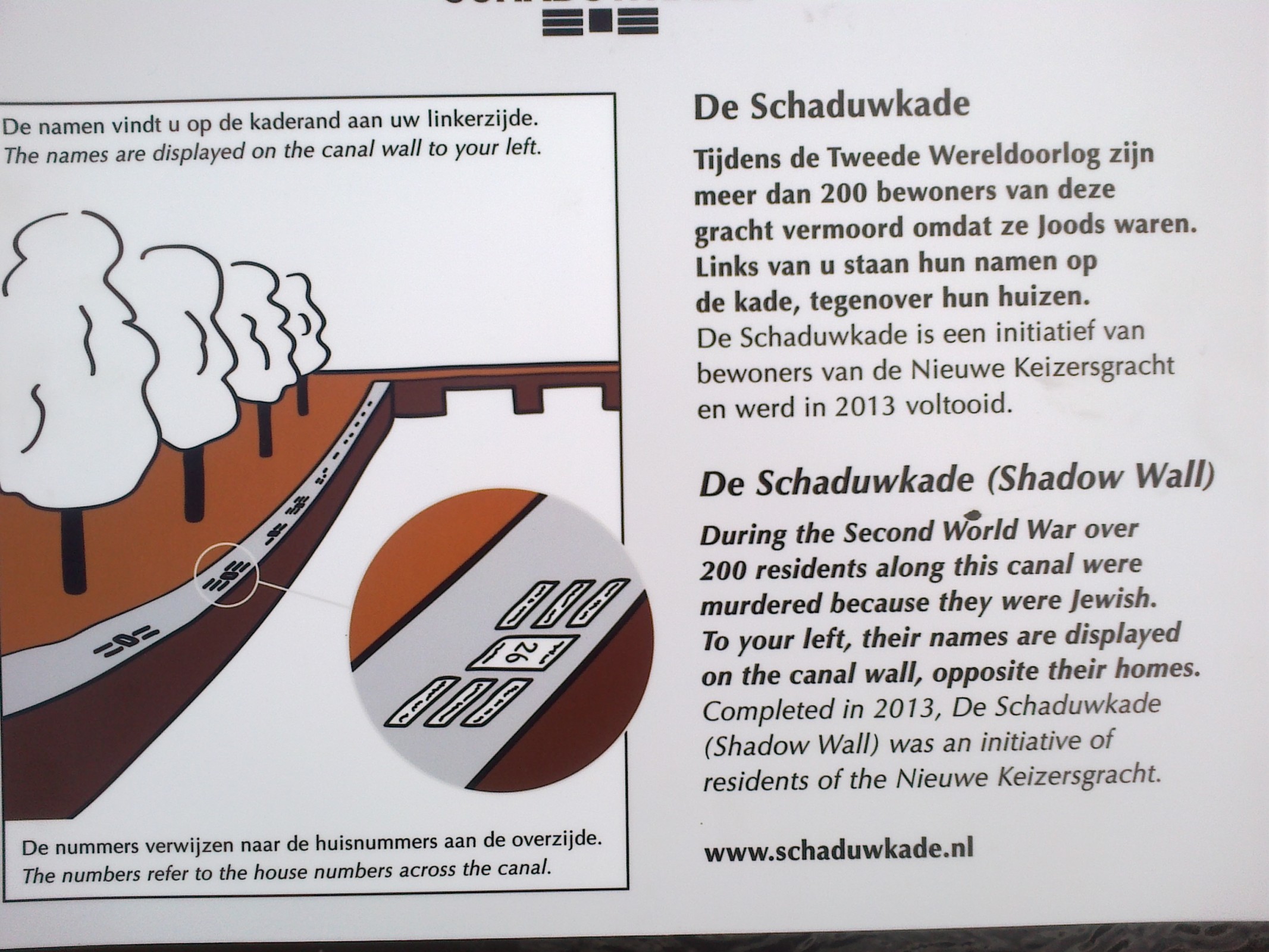 Jak jsem tak chodila podél grachtů, upoutal mě nápis, že tady u tohoto malého kanálu žili Židé. Jmenuje se Schaduwkade - Smutný kanál. U jeho břehu stály domy, v nichž žili amsterdamští Židé. Domy byly během 2. světové války srovnané se zemí a na jejich místech jsou cedulky se jmény bývalých obyvatel.