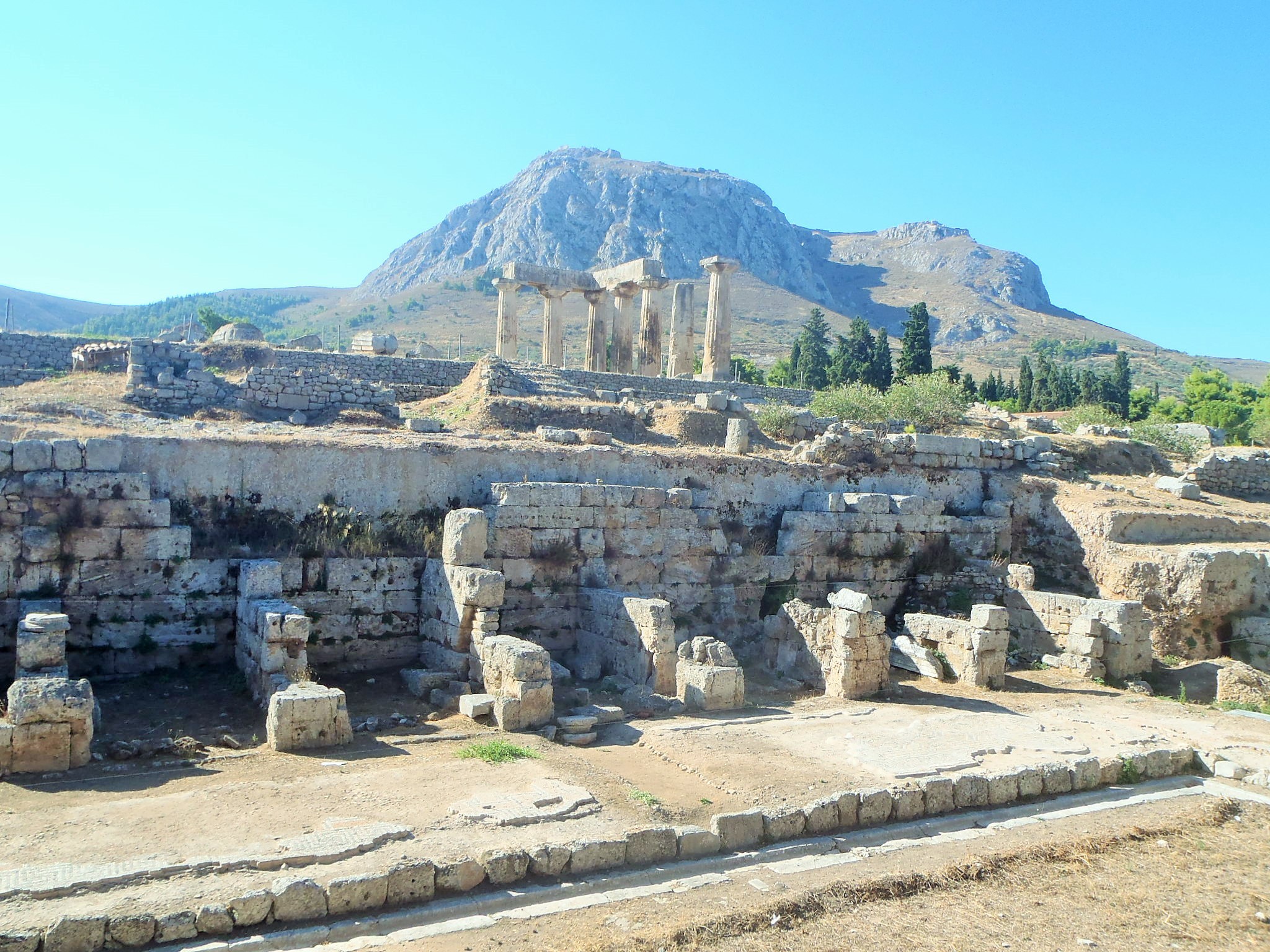 Najdeme tady zbytky chrámu boha Apollóna (zroku 550 př. Kr.), zachovaly se dórské sloupy. Z Oktaviina chrámu také zůstaly sloupy. Římská agora má zachovalé prostory obchodnických a řemeslnických krámků. Z agory vedou schody ke starověké cestě do přístavu Lechaion. Na mramorové kašně Peirene se zachovaly římské nástěnné malby. Vedle muzea zůstala studna ve skalní puklině od zemětřesení.