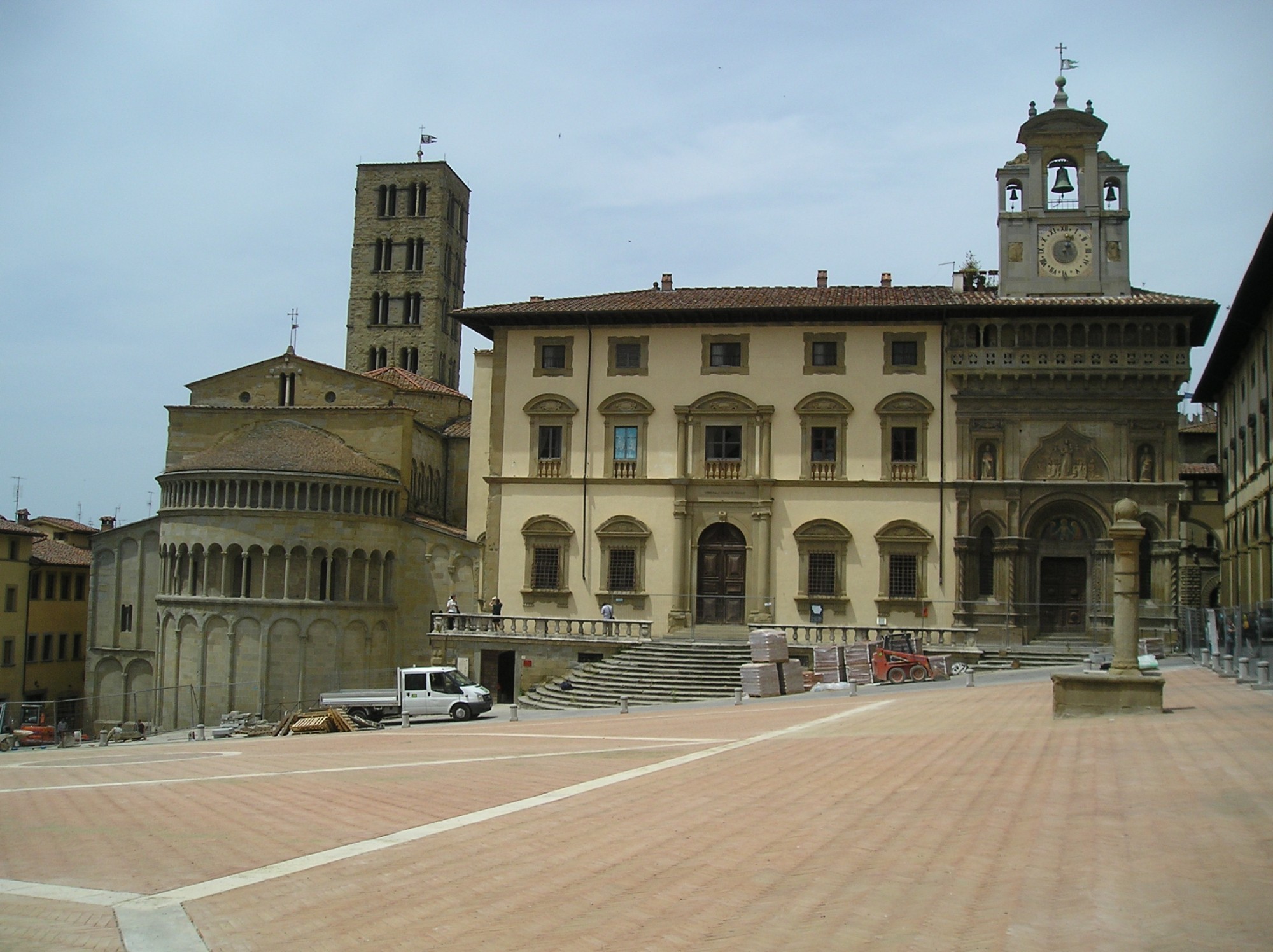 Centrem města je nepravidelné, široké, lehce se svažující Piazza Grande. Na jeho západní straně stojí apsida kostela Pieve Santa Maria, dále Palazzo del Tribunale ze 17. století s balustrádou a venkovním schodištěm a Palazzo della Fraternita, který vznikl v letech 1375 až 1460. Na východní straně náměstí stojí vysoké středověké domy. Severní stranu náměstí ohraničuje Palazzo delle Logge. Podobu paláce navrhl roku 1573 Giorgio Vasari.