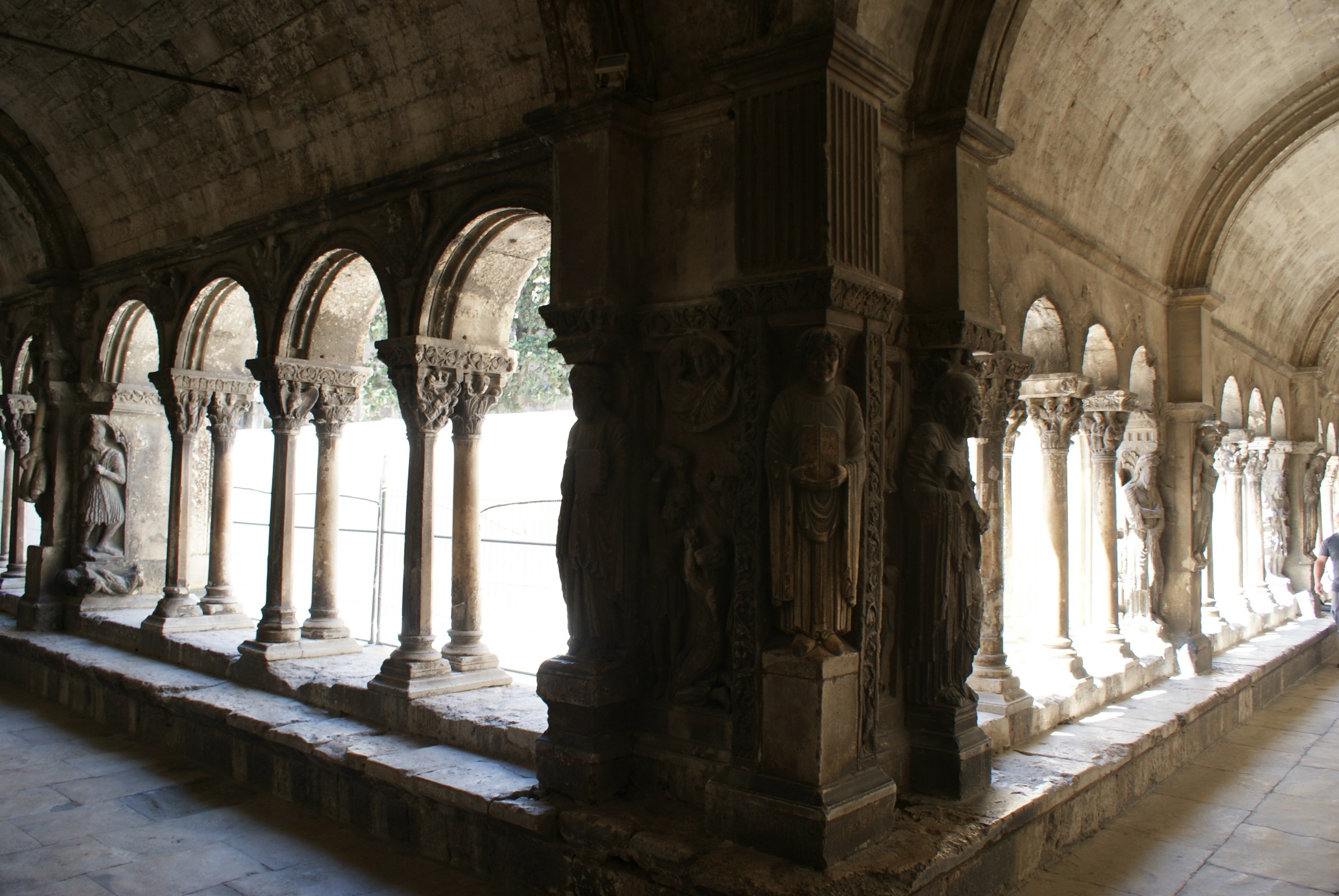 Východní galerie byla postavena na přelomu 12. a 13. století a má již některé gotické prvky, včetně zobrazení Příběhu moudrých a pošetilých panen nebo symbolů čtyř evangelistů. Pašijový příběh je zde vyprávěn na pilířích, zatímco obrazy z Kristova života najdeme na vyřezávaných hlavicích sloupů. Uvidíme zde tedy postupně scény z Kristova dětství, Zvěstování a Navštívení Panny Marie a Narození Páně, ale také erb Arles nebo orla s roztaženými křídly, tedy symbol císaře Svaté říše římské. Zajímavé je ztvárnění Zvěstování pastýřům, kde vidíme dvě kozy, lezoucí na strom života. Na dalších pilířích začíná příběh o utrpení a bičování Krista nebo zobrazení Jidáše, svírajícího třicet stříbrných. Závěr galerie tvoří Vraždění neviňátek, Cesta do Egypta, tři mudrcové před Herodem, Klanění tří králů a anděl v Josefově snu. Nechybí ani sochy sv. Jana a Matky Církve, zobrazení Kristova vstupu do Jeruzaléma, alegorické zpodobnění Konstantinova vítězství nad pohanstvím, Křest Kristův, ďábel lákající Ježíše nebo Poslední večeře s Jidášovým polibkem. A najdeme zde také postavy krále Šalamouna s královnou ze Sáby.