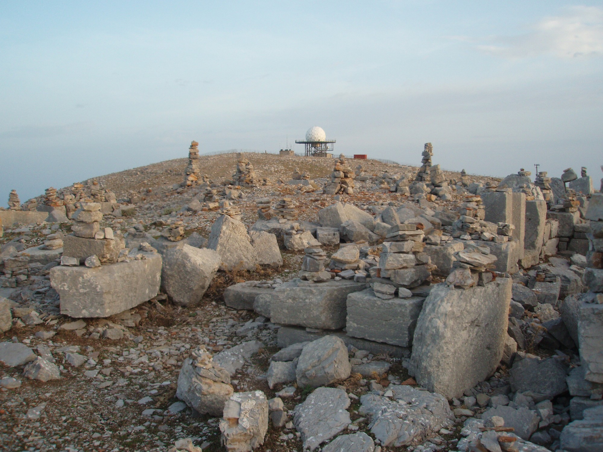 V 7 hodin 25 minut přicházím na nejvyšší místo ostrova. Atavyros se jmenuje jednak horský hřeben, který se táhne středem ostrova a také nejvyšší hora (1.215 m.n.m) tohoto pohoří i celého ostrova. Nachází se zde zajímavý kulovitý radar, asi radiokomunikační nebo vojenský objekt a na vedlejším návrší jakési historické místo, asi pozůstatky nějaké antické stavby. Kochám se vycházejícím sluncem a užívám si krásné výhledy na celý ostrov. Chvilku obcházím vrchol a rozhlížím se všemi směry. Je to tady oplocené, ale není to jen tak nějaké pletivo. Hezký bytelný plot s podezdívkou a mřížemi. Ve dvou polích mříže chybí. Jdu se podívat, co je tam tak zajímavého. Prohlížím si zbytky jakéhosi chrámu nebo budovy. Jsou to jenom ruiny, ale za podívání to stojí.