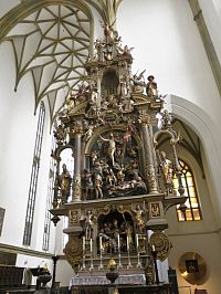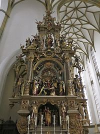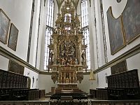 Za pozornost jistě stojí také kazatelna a chórové oltáře, které zhotovil řezbář Hans Degler v letech 1604 až 1608. Hlavní oltář i kazatelna však zřejmě vznikly podle návrhu Hanse Krumpera a jedná se o pětipatrovou dřevěnou konstrukci s množstvím polychromovaných skulptur. V centrální svatyni je zobrazeno narození Krista ve stylu betlému. Vidět zde můžeme také Korunovaci Panny Marie nebo sv. Petra a Pavla. Hlavní oltář bývá označován za jednu z nejvýznamnějších ukázek jihoněmecké renesance, dokonce již s některými raně barokními prvky. Boční oltáře sv. Afry a sv. Oldřicha jsou čtyřpatrové.