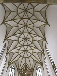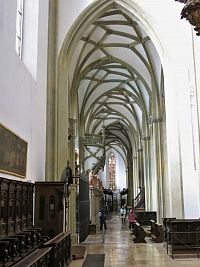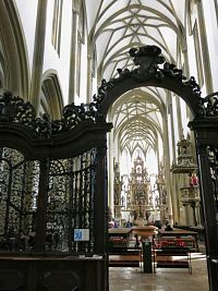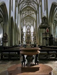 Jednoduchou monumentalitu kostela umocňuje vynechání otevřeného opěrného systému. Na severní straně je před chórem umístěna kaple Panny Marie se spodní sakristií v podobě bočního chóru. Kružba oken je již částečně renesanční. Mohutné západního průčelí naopak připomíná někdejší funkci klášterního kostela. Chrámový trojlodní interiér charakterizují hlavně bohaté síťové a hvězdicové klenby. které zejména nad bočními loděmi vytvářejí složité obrazce. Zvláště malebná je jižní boční loď s řadou kaplí a vyčnívajícím baldachýnem Simpertské kaple. Chór s hvězdicovou klenbou je uzavřen pěti stranami osmiúhelníku.