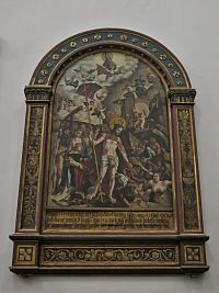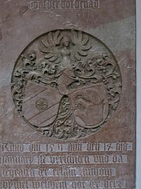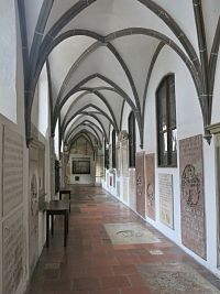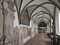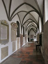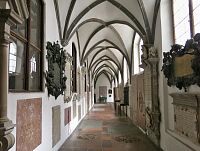 Mezi nejzajímavější „exponáty“ křížové chodby patří náhrobek lékárníka a bývalého karmelitánského mnicha Georga Sturma z roku 1556 (erb smrti podle dřevorytu Hanse Holbeina). dojemný náhrobek Anny Kathariny Ether (+1679) a cyklus maleb Abrahama del Hel z roku 1576 s tématem Alegorie vykoupení.