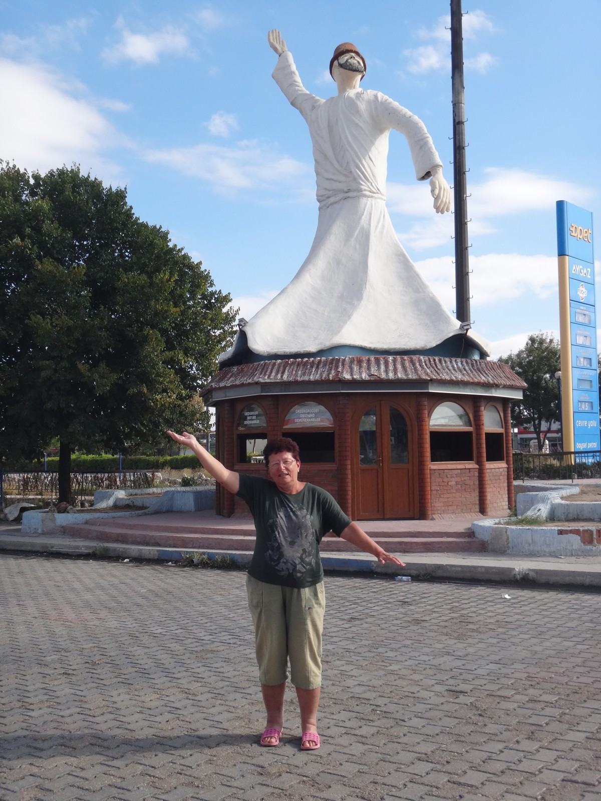 Z Alanye do Kappadokie je to přibližně 600 km, proto jsme vyjížděli již v půl čtvrté ráno. První zastávku jsme dělali po cestě v malé restauraci spojené s obchodem, kde jsme snědli zásoby, které jsme dostali místo snídaně v hotelu. Jaký balíček jsme dostali na dva dny je vidět z fotografie (3 kolečka salámu, trochu sýru, máslo, malinké kousky zeleniny, ovoce a chléb). Ke této vydatné snídani jsme si koupili za 3 TL na povzbuzení alespoň kávu. Další zastávka na občerstvení pak byla u sochy derviše, kde jsme si udělali fotografie. Ještě před obědem nás čekala prohlídka skalního města ve vesnici Saratli (viz samostaný popis).