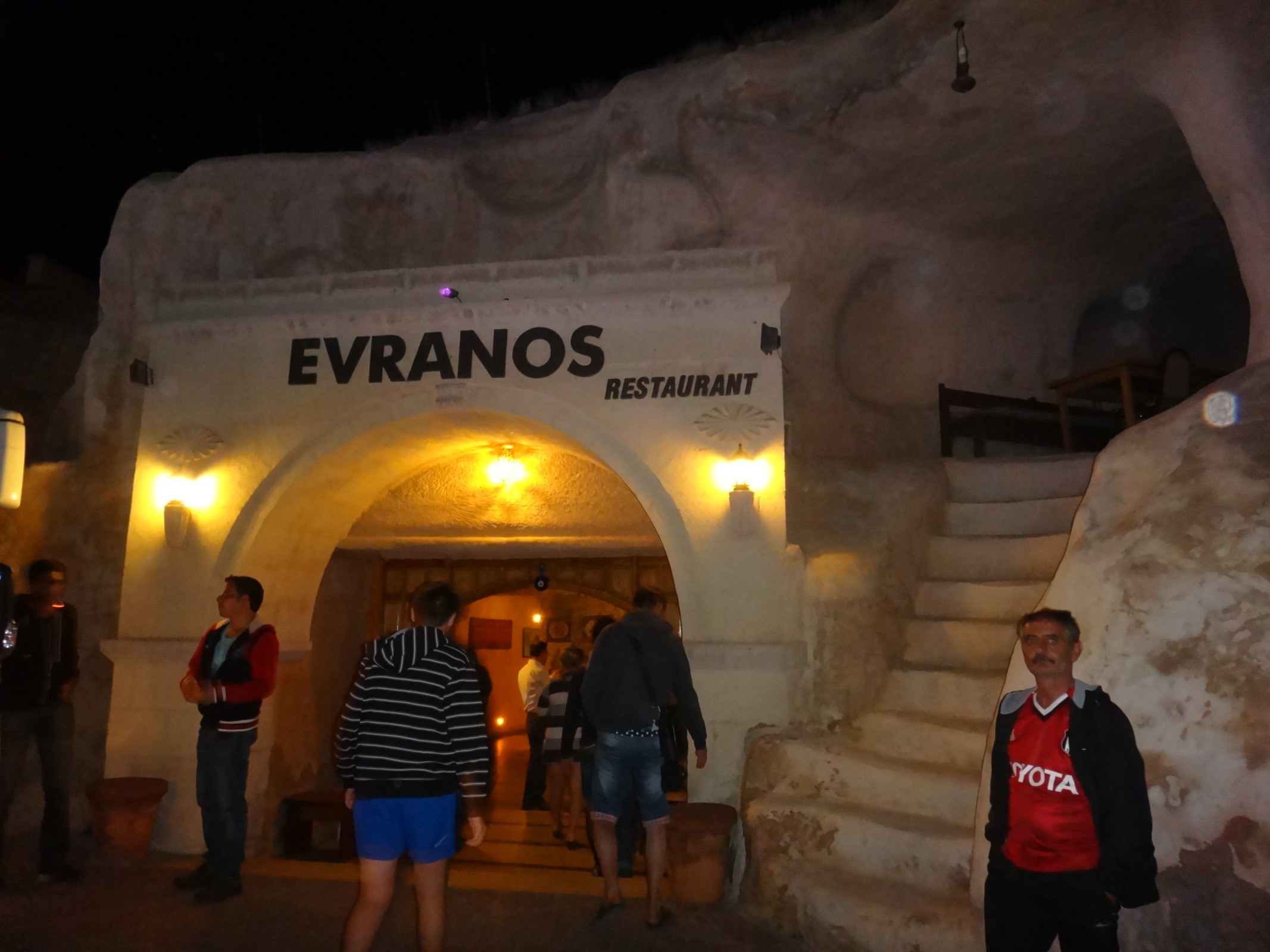 Po večeři v hotelu Atilgan v Ortahisaru, kde jsme ubytováni, jedeme na představení pod názvem "Turecký večer" do nedalekého městečka Avanos do restaurace Evranos, která je vytesaná ve skále. Jedná se o nejznámější tradiční tureckou show nejen v srdci Kappadokie (25 euro). Restaurant Evranos je výborným místem pro její konání s kapacitou 400 míst. Naše mezinárodní skupina (Švédové, Rusové, Ukrajinci, Bělorusové) má zamluvené dva stoly, na nichž je nachystáno malé občerstení a dosti pití. Nápoje nealkoholické (džus, pepsi, voda) i alkoholické (červené a bílé víno, vodka), k jídlu zelenina, sýr, oříšky.